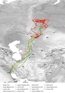 Figure 3. Movements of 6490 during summers 2021 – 2025. The heavy use east of Aktobe, Kazakhstan was mostly after the breeding season had ended and before concerted migration had started